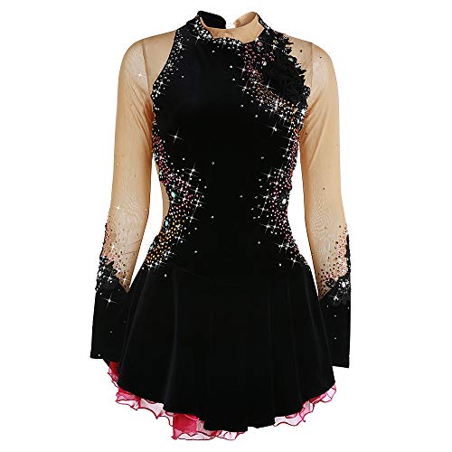 Kmgjc Konståkningsklänning dam flickor skridskoåkning klänning svart hög elasticitet tävling skridskoåkning kläder handgjord strass långärmad skridskoåkning konståkning