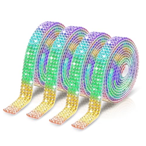 4 rullar strassremsor, 1 gård, strassband, självhäftande bling, glitter, trim diamant, bälte, tejp, diamantklistermärken för hantverk, bröllop, födelsedagskläder, dekoration (regnbåge)