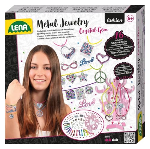 Lena 42658 – Hantverksset metallsmycken med kristallädelstenar, komplett set med 16 metallsmycken, 6 band, 650 strasstenar och glitterset för armband och halsband barn från 8 år