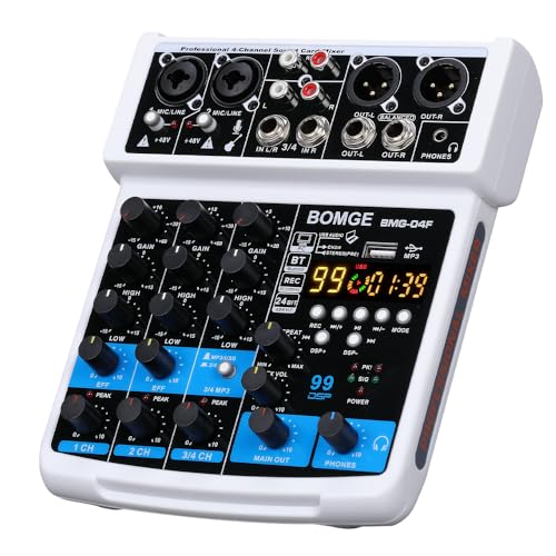 BOMGE 4-kanals mini-DJ-ljudmixergränssnitt med MP3, USB, Bluetooth, stereoinspelning, 48V fantommatning, 99 DSP för karaoke, framträdanden, kyrkosång och streaming