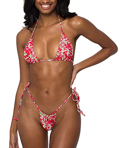 TASHEHE Women's Triangle Thong Bikini Set Sexy String Brazillian Two Piece Swimsuit Cute Bikini Bathing Suit - Rose Red - Small