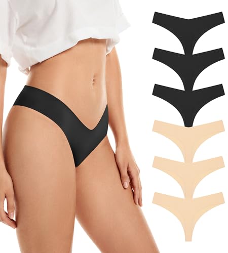 SHARICCA Sömlös sträng för kvinnor, osynliga tangas, underkläder, kvinnor, med låg midja, V-midja, andas, ingen show stringkalsonger, set, (6-pack) 3 svart 3 beige, L