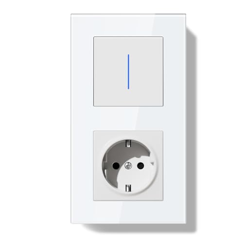 BSEED LIFE strömbrytare med uttag, 1-vägs 1-vägs uttag, 86 x 157 mm dubbel strömbrytare infälld med glasram, enkel montering för lägenhet, hus, kontor (med indikator vit)