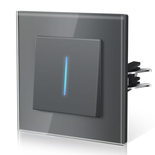 BSEED Ljusbrytare av glas, infälld strömbrytare med klor, växelströmbrytare med bakgrundsljus, enkel installation, ny e-serie, 1 fack 1 väg, 86 mm grå