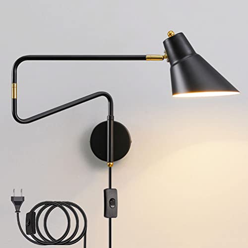Industriell vägglampa med strömbrytare och stickpropp, vägglampa justerbar metall lång arm, väggläslampor med kabel vridbar sänglampa Sovrum Vardagsrumslampa Väggbelysning inomhus E27,Black