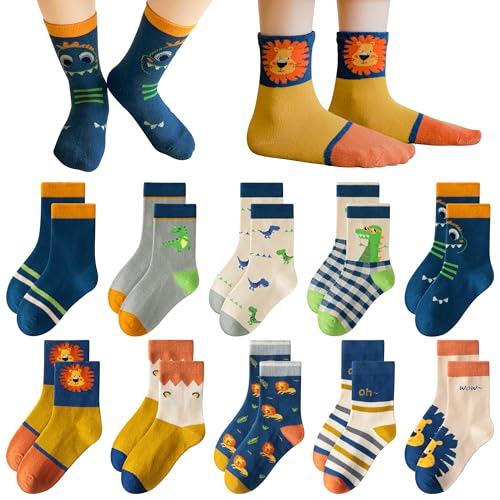 Baogaier 10 par strumpor barn bomull, unisex söta tecknade färgglada djurtryck andningsbara bekväma strumpor för vår höst vinter barn flicka 2–12 år, 21–37, Dinosaurier, 25-28