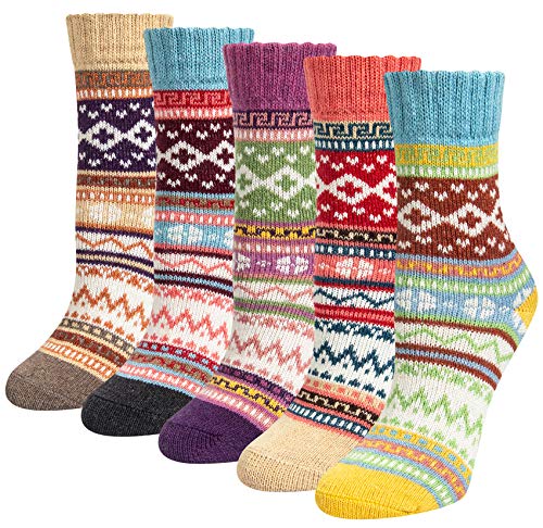 Meloday 5-pack tjocka vinter varm ull vintage casual vandring crew-strumpor för kvinnor mjuka och bekväma, Randig, One Size