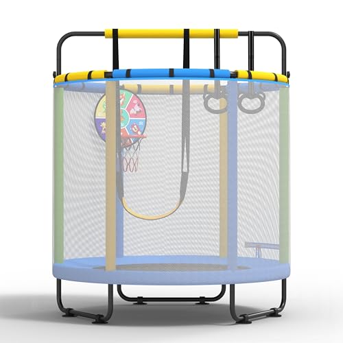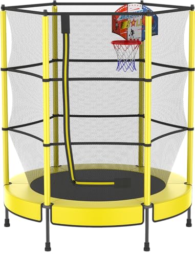 PILIN Studsmatta för barn med basketkorg, 145 cm inomhus utomhus hoppsäng med fjädrar, upphöjt säkerhetsnät – födelsedagsleksaker för pojkar flickor, barnjulklapp