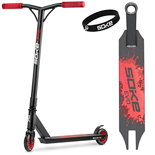 SOKE Evo Stunt Scooter för extrema skateboardparkcyklingar – ABEC-9 kollager av förkromat stål – PU-hjul 88A – Y-barstyre med TPR-handtag – aluminiumdäck röd