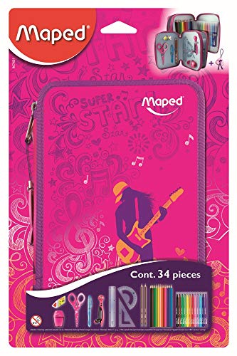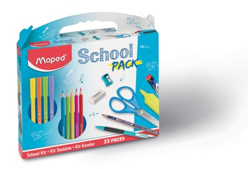 Maped - Skolpaket med 33 delar - färgpennor + pennor + grafitpennor + blyertspenna + markeringspenna + suddgummi + pennvässare + pulssax - för barn från 4 år