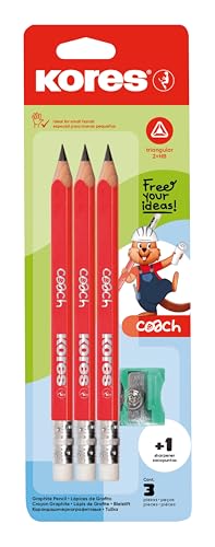 Kores - Coach: Jumbopennor för barn, mjuk HB gruva och suddgummi, ergonomisk triangulär form, skoltillbehör för att utveckla skrivning, 3-pack