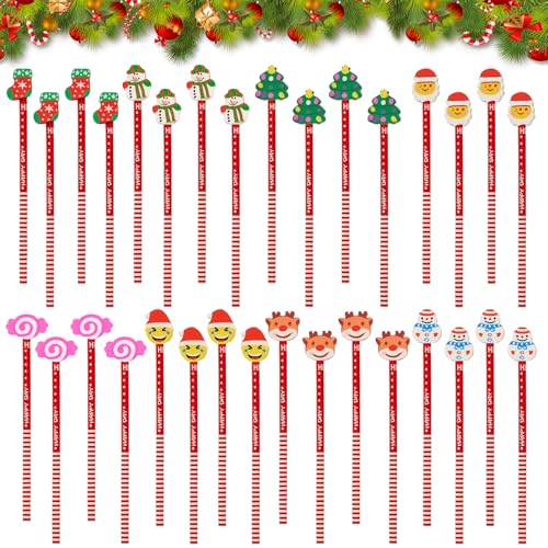 KAHEIGN 50 st julpennor med suddgummi, 10 stilar tecknade radergummi på pennans ände, snögubbe strumpa pepparkaksgubbe hatt julgranspennor för barn julstrumpa låda fyllmedel festgåvor