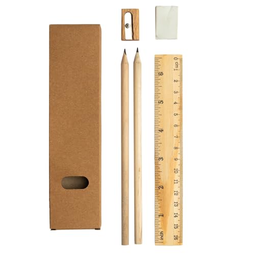 Chinchilla® hållbart skrivbordsset av trä: suddgummi, pennvässare, linjaler och blyertspennor i återvunnen kartongförpackning | Perfekt skoltillbehör för miljömedvetna barn