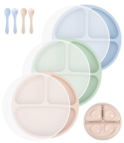 SinLaw Sugkoppstallrik för baby, set med 3 sugkoppar i silikon med fack och lock, matningsset för småbarn och självmatning