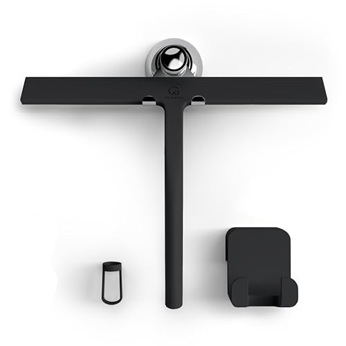 GÜTEWERK Duschavdragare set med hållare – svart 28 cm bred – utan borrning silikonskrapa dusch badrum fönster fönsterskrapa rostfritt stål kärna skivskrapa med sugpropp hållare badavdragare