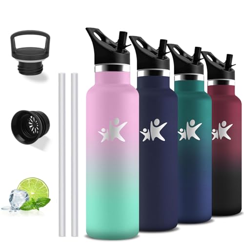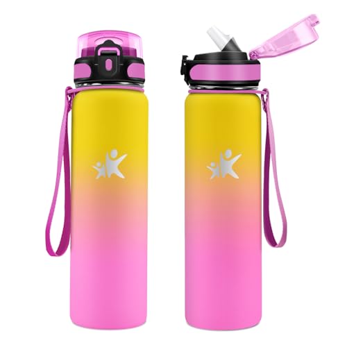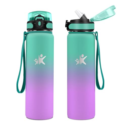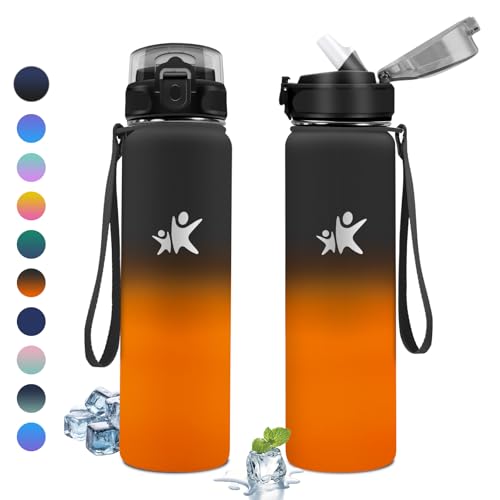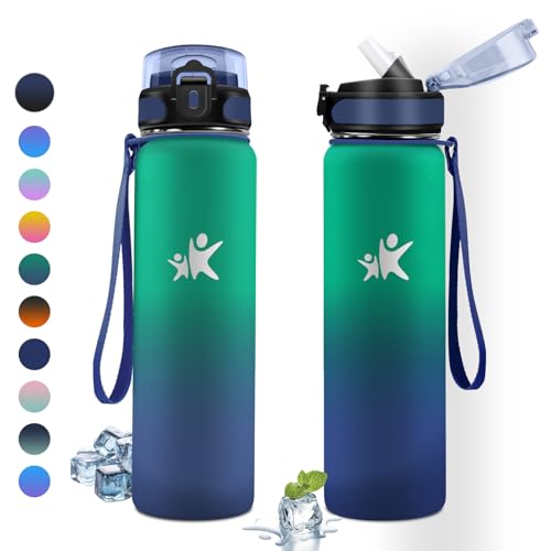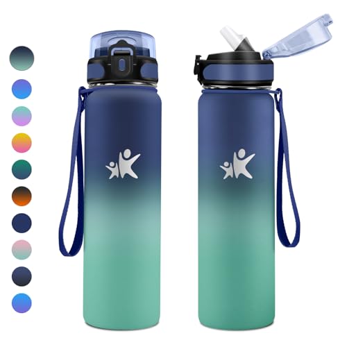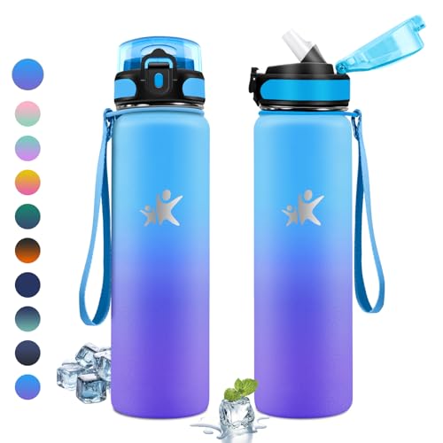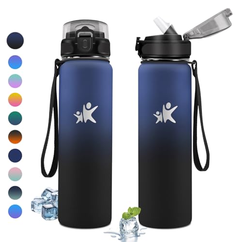 KollyKolla 1L vattenflaska i rostfritt stål, vattenflaska med sugrör, återanvändbar termisk flaska, lätt att öppna, läckagesäker, BPA-fri, vattenflaska för camping, skola, Gimnasium