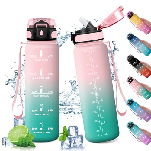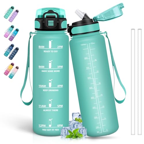 Vattenflaska 1 liter, tidsmarkörflaska, vattenflaska med sugrör, läckagesäker, återanvändbar flaska för vuxna, skola, gym, kontor, cykel, gym, löpning,