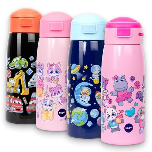 Fringoo Vattenflaska för småbarn med sugrör 350 ml flaska i rostfritt stål, isolerad dubbelvägg, 100 % läckagesäker och låsbar, bärhandtag, 12 timmars temperaturkontroll, rosa söt djurdesign