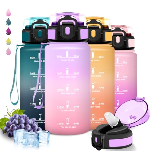 Flaska, 1 liter flaska, lätt att bära, läckagefri gymflaska, sugrör, flaska med sugrör, för vuxna, vattenflaska med drickstid, för sport, cykling, vandring, yoga, lila