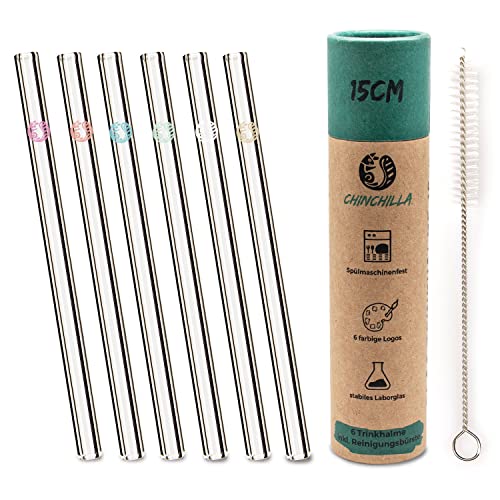 Chinchilla® 6-pack sugrör av glas | 15 cm transparenta med logotyper | återanvändbara och plastfria sugrör av BPA-fritt glas | inklusive förvaring och rengöringsborste