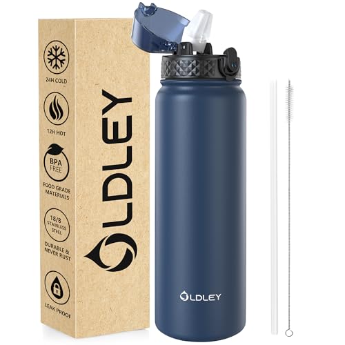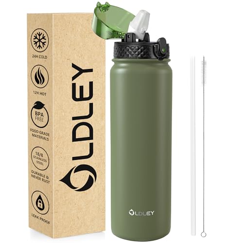OLDLEY Vattenflaska i rostfritt stål med sugrör 1 l vakuumisolerad stor dryckesflaska metall vattenflaskor 1 liter läckagesäker håller drycker varma kalla för cykel, sport, gym, vuxna kvinnor män
