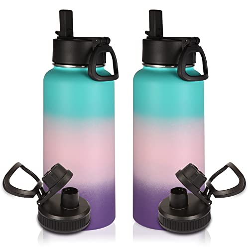 Volhoply 1 liter vattenflaska i rostfritt stål, två paket, vakuumisoleradflaska med sugrör, 1 l metall BPA-fri för barn, sport, skola (grön-blå färggradient, 2 i set)