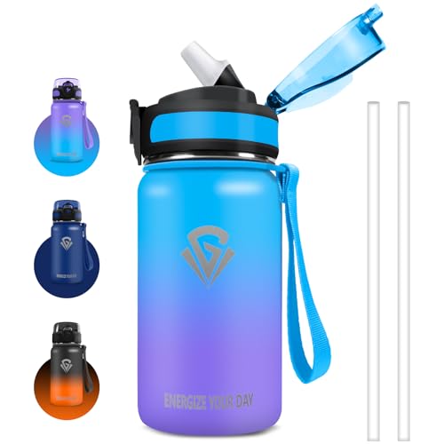 Volhoply Isolerad vattenflaska för barn, 532 ml, rostfria med lock och sugrör, dubbelväggig vakuumflaska i metall, återanvändbar, med vid öppning för kalla drycker (lila/blå, 1 set)
