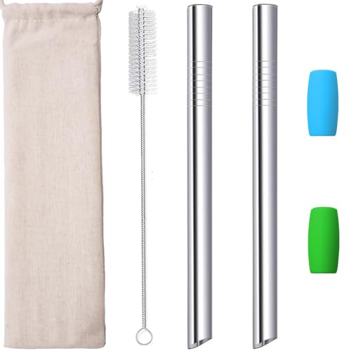 Metall Boba sugrör återanvändbara smoothies rostfritt stål halm 12mm brett för jumbo bubbla te milkshakes mjölk te med silikonspetsar bärväska borste, Silver 2PCS