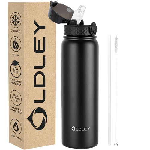 OLDLEY Vattenflaska i rostfritt stål med sugrör 1 l vakuumisolerad stor dryckesflaska metall vattenflaskor 1 liter läckagesäker håller drycker varma kalla för cykel camping sport gym vuxna kvinnor män