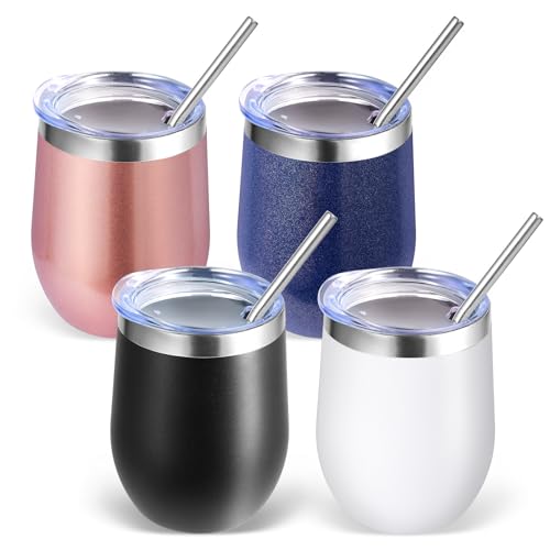 Volhoply 350 ml rostfritt stål vinglas med lock bulk 4-pack, 350 ml dubbelvägg vakuum stamlösa vinglas, metall rese kaffemugg med sugrör, isolerade koppgåvor för kvinnor, jul (mix, 4 set)