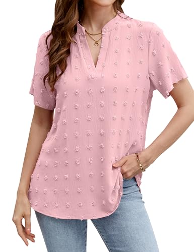 Blooming Jelly Womens White Chiffon Blouses Short Sleeve V Neck Shirts Summer Casual Polka Dot Tops(Small, Light Pink)