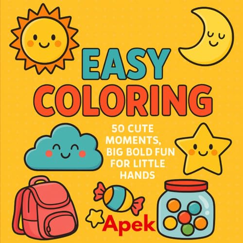 EASY COLORING: 50 Cute moments, big bold fun for little hands includes images like sun, moon, star, cup, flowers etc