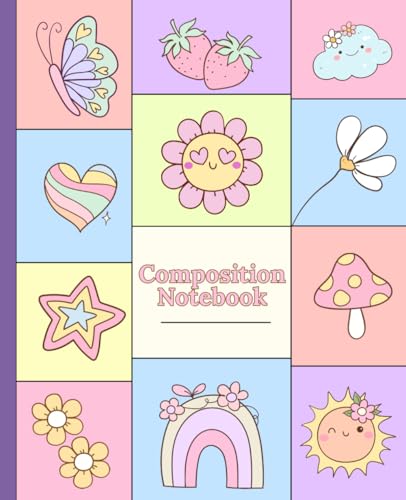 Composition Notebook: Pastel Aesthetic Grid Cover with Flowers, Sun, Rainbow, Star, Mushroom, Heart, Butterfly & Strawberries.: College-Ruled for School or Work.