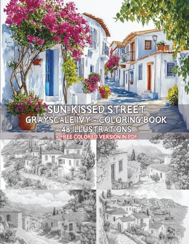 Sun-Kissed Street, 48 Grayscale Coloring Pages + Free Colored Version in PDF - Greek village - Stress Relief - Relaxing Seaside Houses: Large US Letter format. Fun and relaxation guaranteed.
