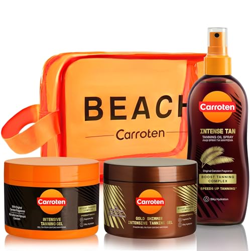 Carrot 3 solvårdsset – solskyddsset av intensiv tanning gel 150 ml, intensiv tanningsolja med kokosoljor 200 ml och after Sun Cooling Gel 200 ml, inklusive praktisk sminkväska