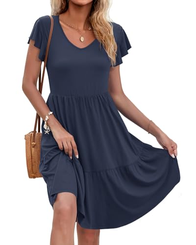 AUSELILY Dam Sommarklänning Elegant Ruffle Petal V-Neck Sundress Kortärmad Ledig Klänning med Fickor, Marinblå, L