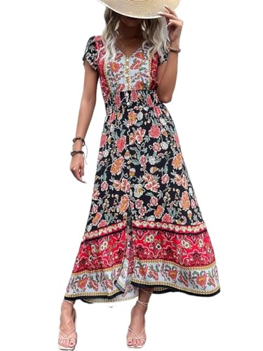 Kvinnors Boho Klänning Vintage Blommigt tryckt Korta ärmar V-ringad Slit Midiklänningar A Line Bohemian Summer Beach Sundress (Color : 22, Size : Small)