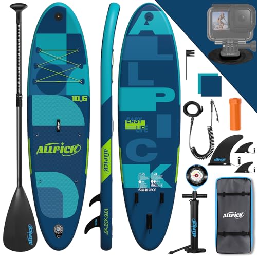 ALLPICK Premium SUP Board set, Stand Up Paddling Board uppblåsbar, med universell kamerahållare, kompletta tillbehör, justerbar paddel, nybörjare, avancerad, 200 kg (skarv – blå modul)