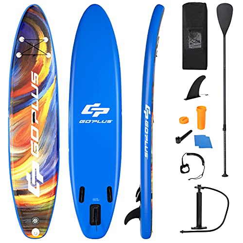 COSTWAY Uppblåsbar SUP-bräda, stående up-bräda, stående up paddlingbräda, inklusive ryggsäck, pump, säkerhetslina, reparationssats, paddel och centrumfena (bomullsblå, 297 x 75 x 16 cm)