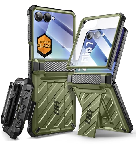 SUPCASE Fodral för Samsung Galaxy Z Flip 7 2025 med Stöd och Bältesklippa (Unicorn Beetle Pro) [Gångjärnsskydd] [Inbyggt Härdat Glasskärmskydd] – Helkroppsmilitärgradigt Skydd (Grön)