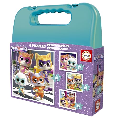 Educa - Set med 4 progressiva pussel för barn i 12,16,20 och 25 delar | SuperKitties | Presenteras i en portfölj så att flickor och pojkar kan våga med olika svårighetsgrader (20341)