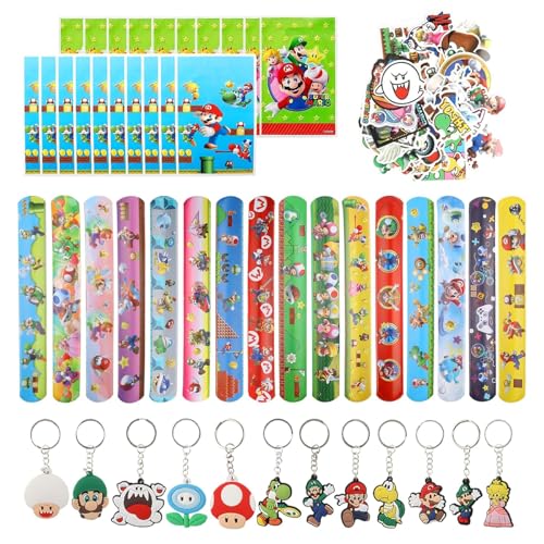 XoeLLe 98 stycken 'Super Ma-rio presentpåsar barnfödelse med 12 nyckelringar barn 50 barn klistermärken 20 presentpåsar 16 Clap Bracelets för gåvor barns födelsedag partytillbehör