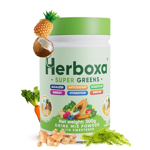 Herboxa Super Greens Pulver med citron- och myntasmak 50 portioner med cikoriaröta, zink och kromgrönt superfood för energi och välbefinnande (300, Kokosnöt Ananas)
