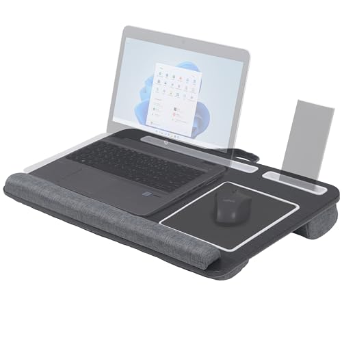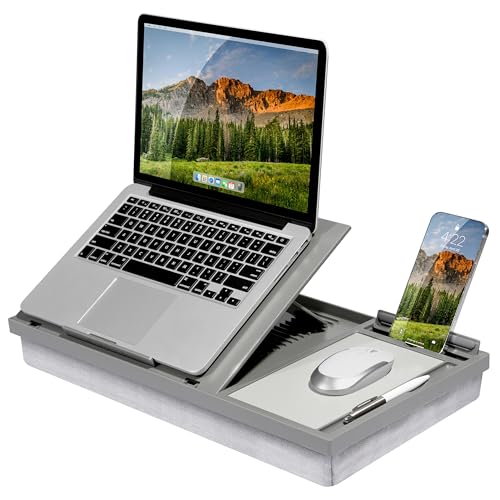 LAPGEAR Ergo Pro knäskrivbord med 20 justerbara vinklar, musmatta och telefonhållare – grå – passar upp till 15,6 tums bärbara datorer och de flesta surfplattor – stilnr. 49405