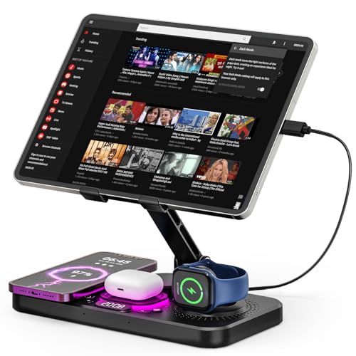 Jubor 4-i-1 trådlös laddningsstation för iPhone, justerbart skrivbordsstativ för surfplatta med LED-nattlampa, vikbart bord iPad-hållare för iPad Pro Air Mini, 4-15,6-tums surfplatta telefoner