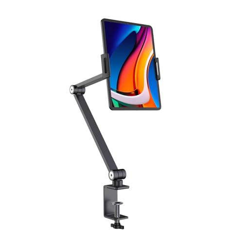 BEWISER iPad-stativ skrivbordsfäste för surfplatta, bärbar skärmarmhållare, aluminiumlegering klämfäste kompatibel med 4,7–15,6 tum skärmtelefon, Kindle, Fire HD, strömbrytare (grå)
