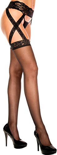 Music Legs Suspender Belt with Attached Stockings, Black