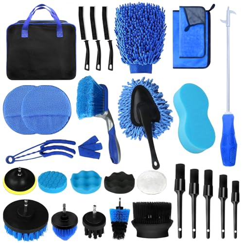 HOVIBU Bilrengöringssats - 30 delar bilvårdsset inomhus och utomhus - biltvättskit med borstar, dammborste, komprimerad svamp etc. - W