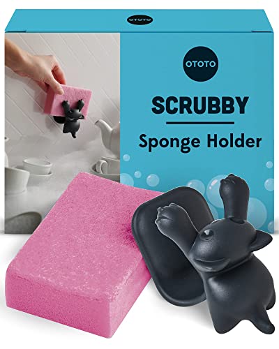 OTOTO Scrubby Svamphållare för diskbänk – grå katt kök svamphållare – diskmaskinssäker disksvamp organisatör – rostfri – 9,9 x 7,9 x 9,9 cm