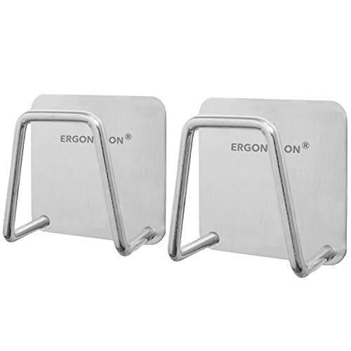 Ergonation Ergonomisk självhäftande svamphållare för disksvamp på diskbänken | vattentät, rostfri hållare för disktrappar, grytlock, dräneringsplugg för mer ordning i köket (silver, 2)